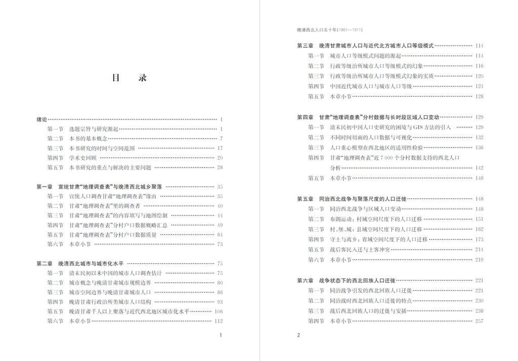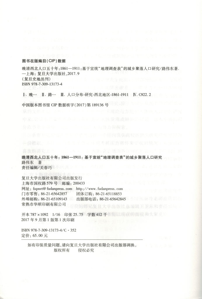 路伟东教授新著《晚清西北人口五十年(1861—1911)——基于宣统“地理调查表”的城乡聚落人口研究》,2017年9月由复旦大学出版社出版,全书八章,共计42万字。该书是一部区域断代人口史学术专著,在系统搜集宣统人口调查“地理调查表”等原始文献的基础上,作者对晚清五十年间西北地区人口问题进行了较为深入的研究。关注重点包括但不限于晚清西北城乡结构、城市与城市化水平、长时段区域人口变动以及不同空间尺度下的人口迁徙等问题。本书附有23张表格和51幅插图。适合历史、人口、地理、社会、经济以及民族等学科的专业人员、政府有关部门和其他具有中等以上文化程度的读者阅读,部分章节对关注历史GIS交叉研究的读者亦有一定帮助。