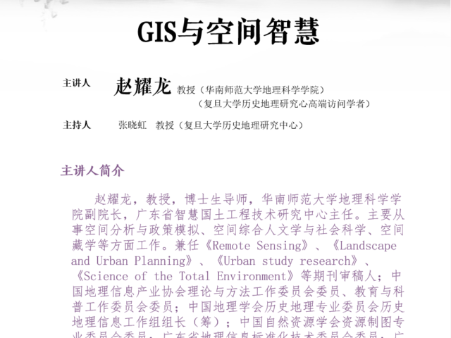 学术交流2020年12月1日2021年6月4日 学术报告:GIS与空间智慧 应路伟东教授邀请,华南师范大学地理科学学院赵耀龙教授于2020年12月获聘复旦大学历史地理研究中心高端访问学者。访问期间,将做两场学术报告。此为学术报告第二更多内容…学术报告:GIS与空间智慧